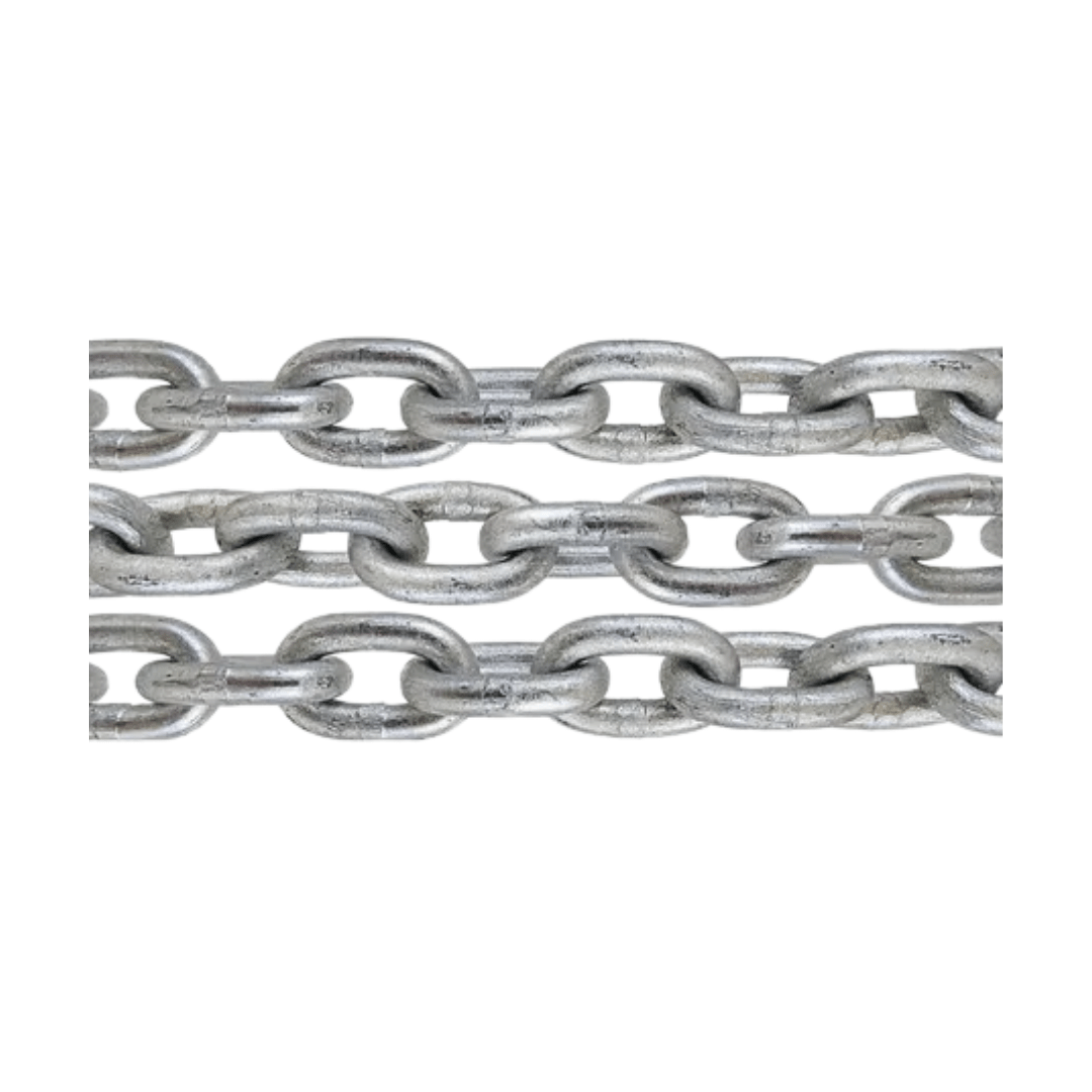 Cadena eslabón corto galvanizada, resistente a la oxidación y uso industrial. Ideal para amarres, sujeciones o cargas.