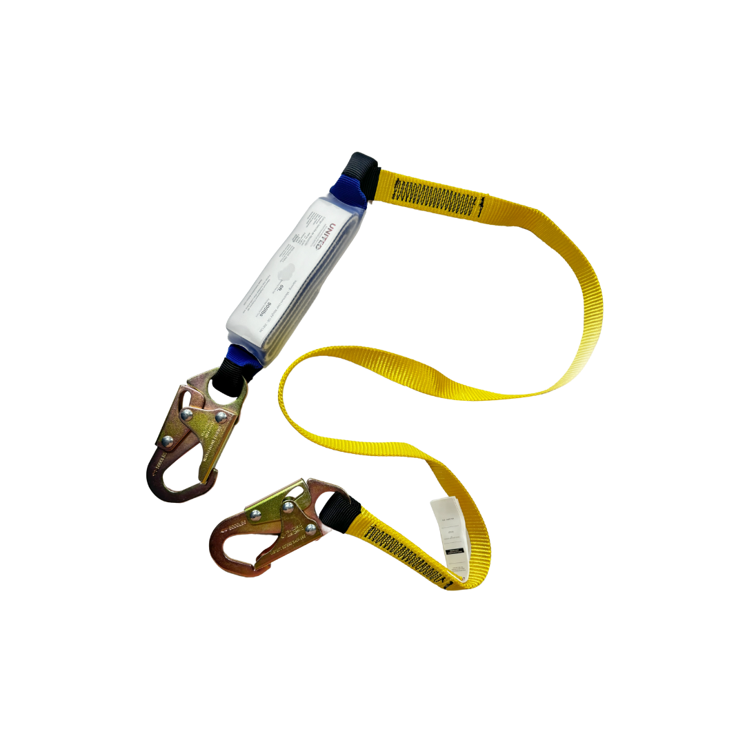Eslinga de absorción sencilla United con gancho pequeño. Certificada ANSI Z359.13, CE y EN 354 para trabajos en altura.