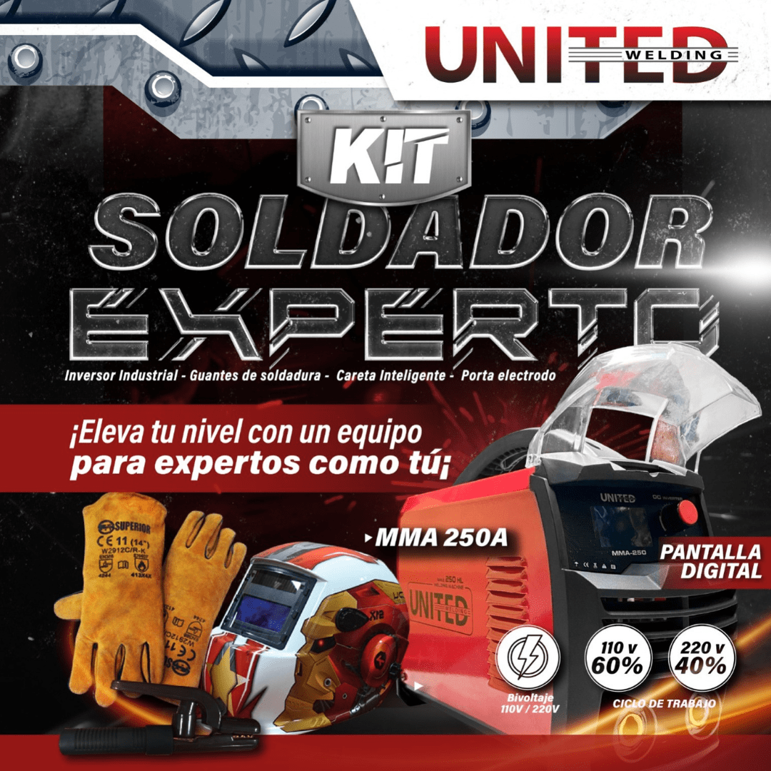 El Kit #2 MMA 250 United Welding es ideal para quienes buscan mayor potencia y rendimiento en trabajos de soldadura. Incluye inversor MMA 250, bivoltaje 110V / 220V, ciclo de trabajo del 60%, además de careta inteligente, guantes Kevlar y porta electrodo, perfecto para talleres y mantenimiento.