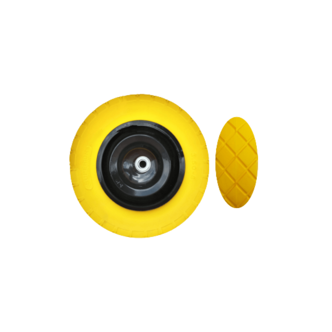 Llanta antipinchazo amarilla para carretilla. Sin mantenimiento, resistente y lista para uso en trabajos exigentes.