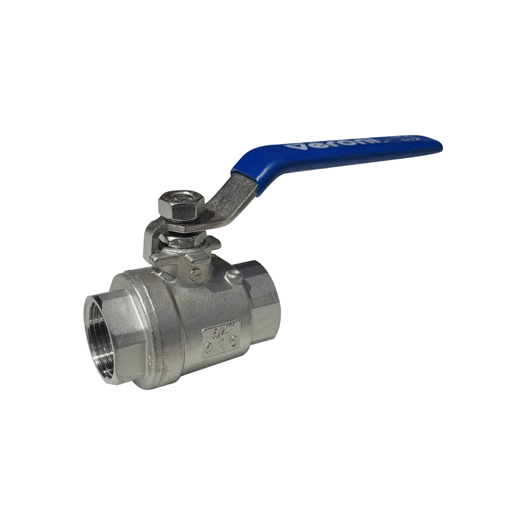 Válvula de bola en acero inoxidable Veroni, resistente y confiable para control eficiente de fluidos en sistemas hidráulicos.